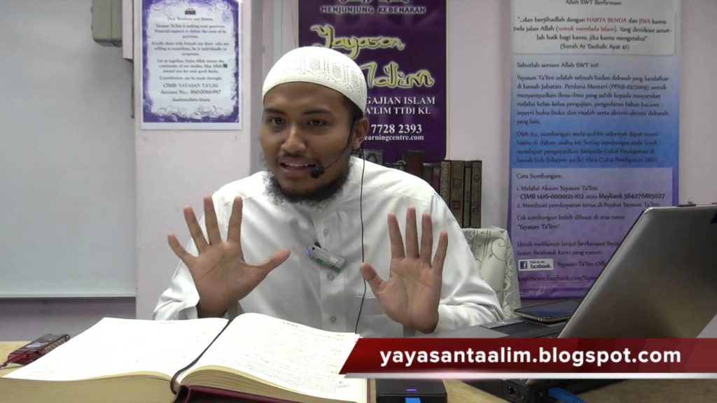 Kelas Talbis Iblis oleh Ustaz Kariman pada hari Sabtu 30 Mei 2015 di Yayasan Ta’lim. Kitab: Talbis Iblis (Perangkap Syaitan) karangan Imam Ibn Al-Jauzi (W. 597H) Setiap Sabtu 8:00 pagi. ———————————————————————– Yayasan Ta’lim adalah sebuah badan dakwah yang berdaftar di bawah Jabatan Perdana Menteri (PPAB-02/2009) untuk menyampaikan ilmu-ilmu agama yang sahih kepada masyarakat melalui kelas-kelas […]